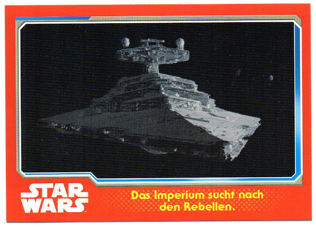Greetings from Germany and a German pack of 2015 Topps Die Riese Zu Star Wars: Das Erwachen Der Macht (Journey to Star Wars: The Force Awakens). This came from the discount bin at the local stationary shop so I had to snag the 3 packs they had. I haven't opened the U.S. or U.K. version of this product so this will be an adventure seeing all the words in German. This set is identical to the UK Version of this Set except everything is written in German. A few years back CynicalBuddha opened the US Version of the pack here. According to the pack back there are over 200 cards in the set (207 to be exact) and 10 cards per pack. There are rainbow parallels 1 in 3 packs and a limited card 1 in every 50 packs. I think I did that translation correctly...why didn't I take German back in high school???! I guess we'll find out what lies within. Grab your half liter of hefeweizen beer and a pretzel.....it's throwback Thursday.